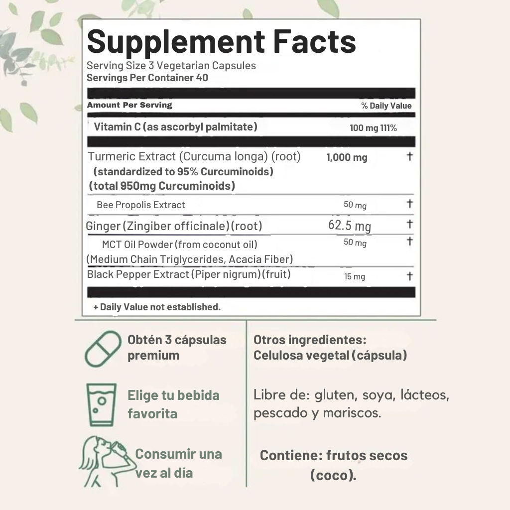 Toma tres cápsulas vegetarianas al día, acompañadas de tu bebida favorita. Su combinación de cúrcuma, curcumina, jengibre, própolis, pimienta negra y vitamina C liposoluble actúa en conjunto para potenciar la absorción y sus beneficios.